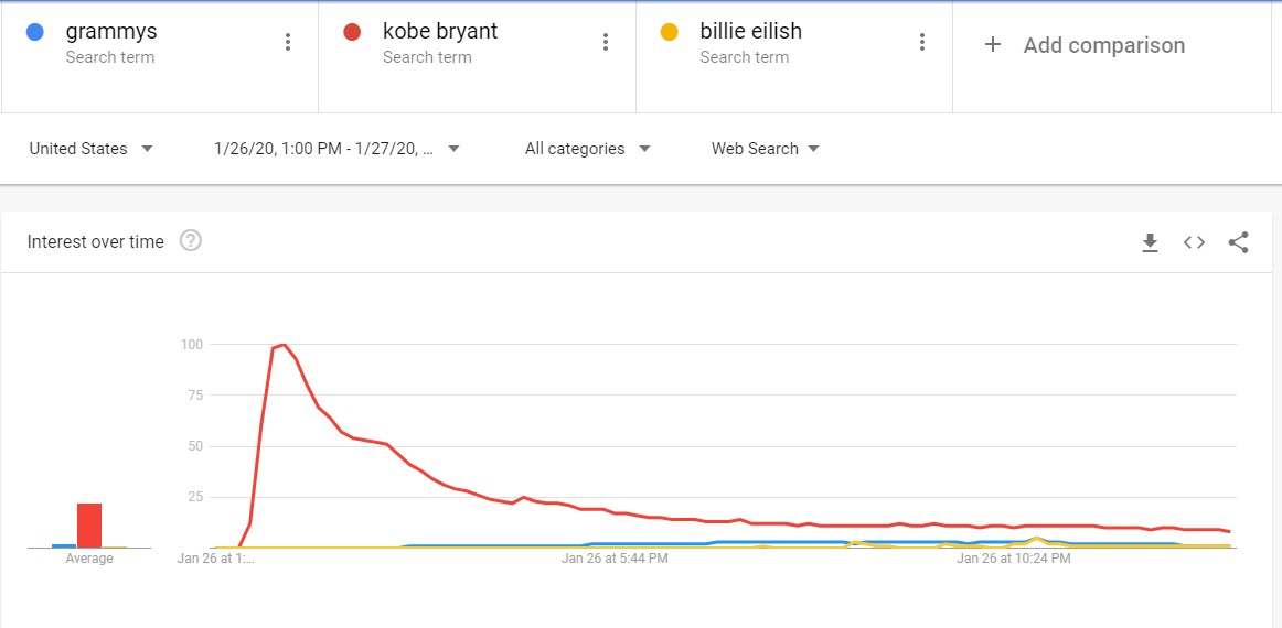 According to a Google search analysis on Google Trends, Kobe Bryant searches were still trending higher throughout the day in comparison to the Grammy’s and Billie Eilish.