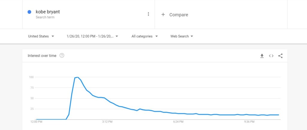 According to a Google search analysis on Google Trends, Kobe Bryant rapidly became a popular search in the U.S. after the news article was published. Prior to the article’s publication, Kobe Bryant searches were seemingly non existent.